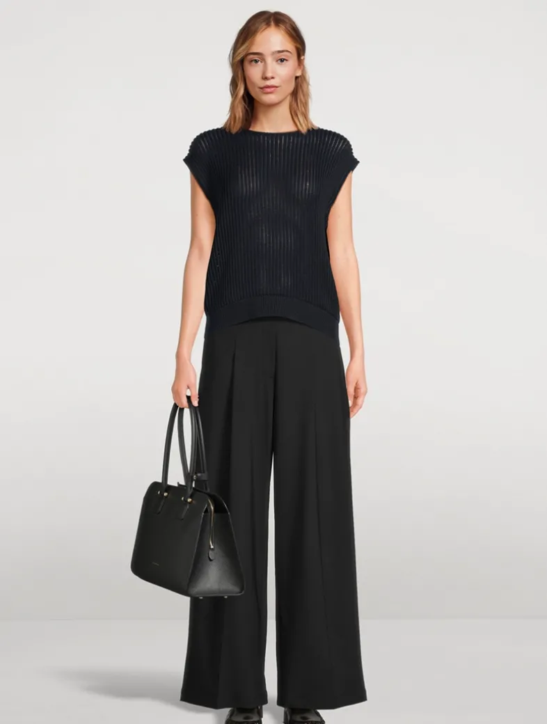 This high-waist, wide-leg trouser features a pleated front, belt loops, side pockets, a back welt pocket, and a button-zip closure, all crafted from smooth stretch wool for polished style and all-day comfort.