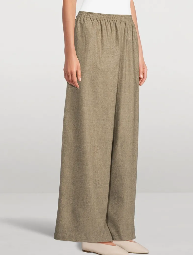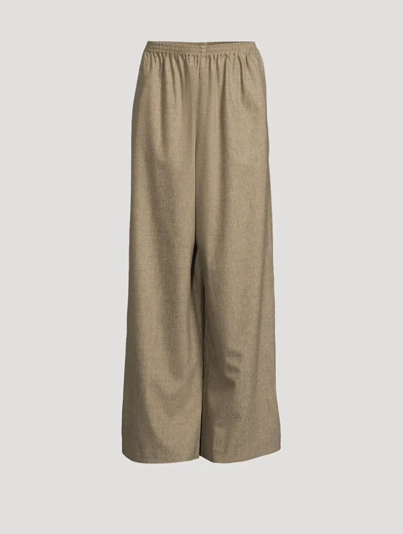 These full-length pants are crafted of a lightweight Italian stretch wool with a hint of cashmere. With their elasticized waist, voluminous wide-leg silhouette, and side seam pockets, they exude a comfortable appeal.