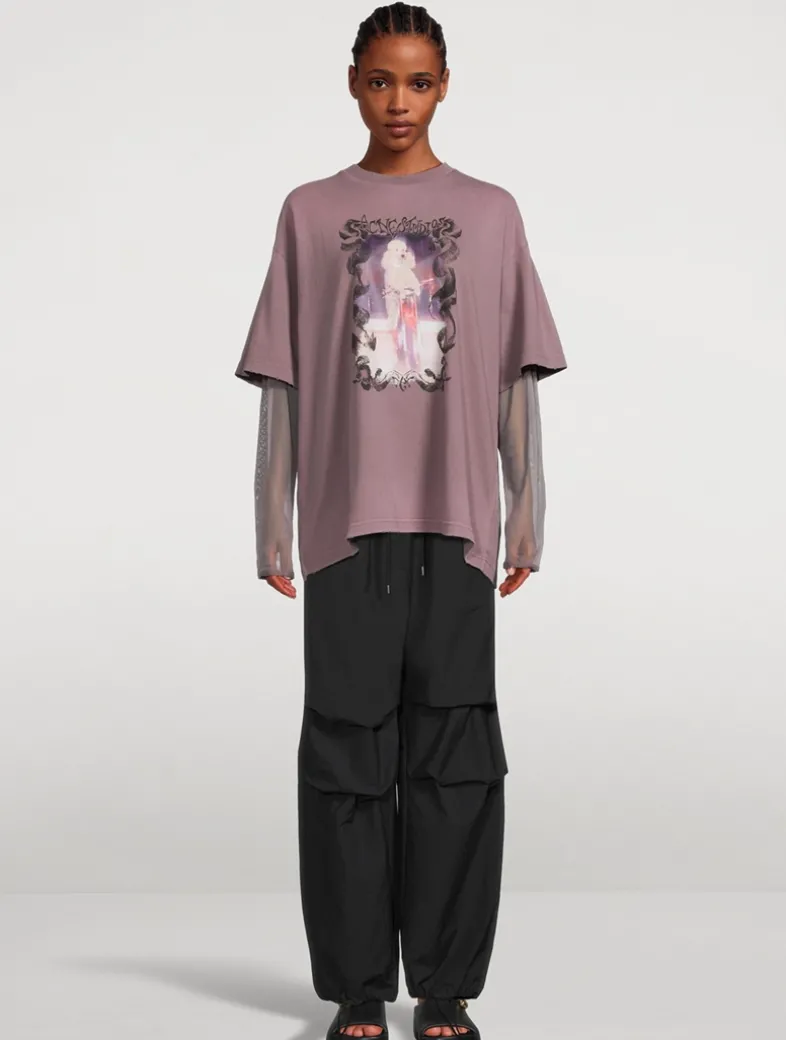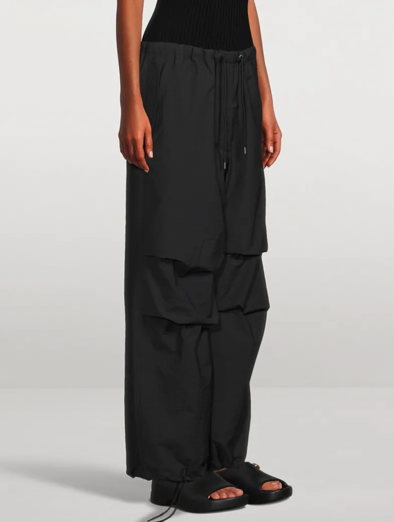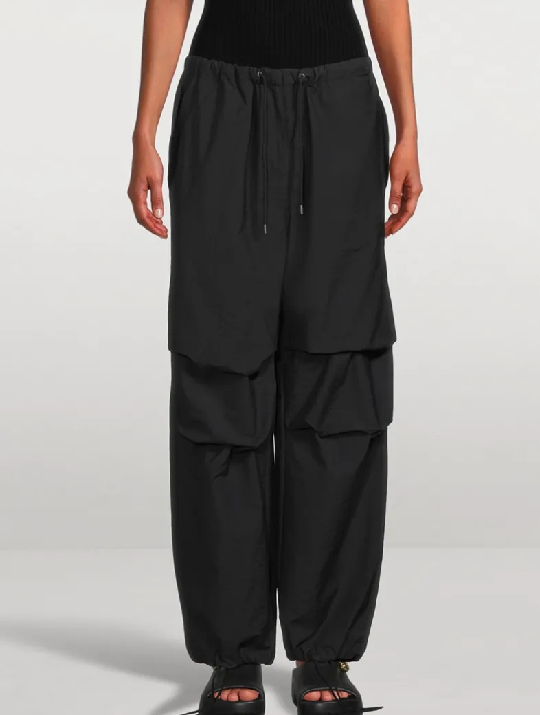 These trousers are crafted from an organic cotton blend with a soft crinkled finish, detailed with an elasticated drawcord at the waistband. They have Acne Studios logo embroidery at the back pocket. Cut to a relaxed fit with a mid-waist, baggy leg, and long length with an adjustable drawcord at the hem.