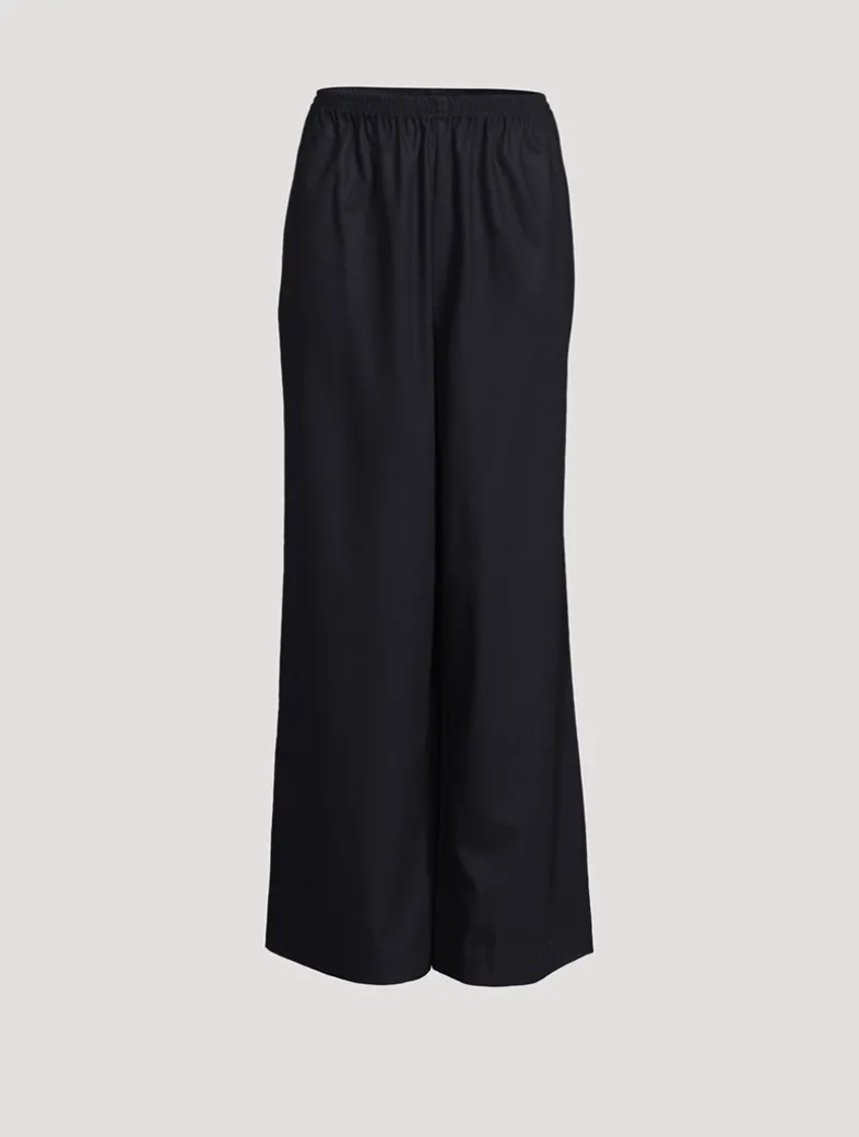 These full-length pants are crafted of a lightweight Italian stretch wool with a hint of cashmere. With their elasticized waist, voluminous wide-leg silhouette, and side seam pockets, they exude a comfortable appeal.