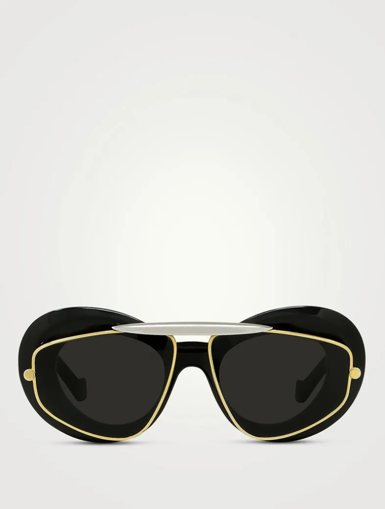 Mixing the cat eye acetate frame from the Curvy family and the pilot metal frame from LOEWE’s FW23 collection, these sunglasses feature only one pair of lenses and the brand’s logo on the arm.