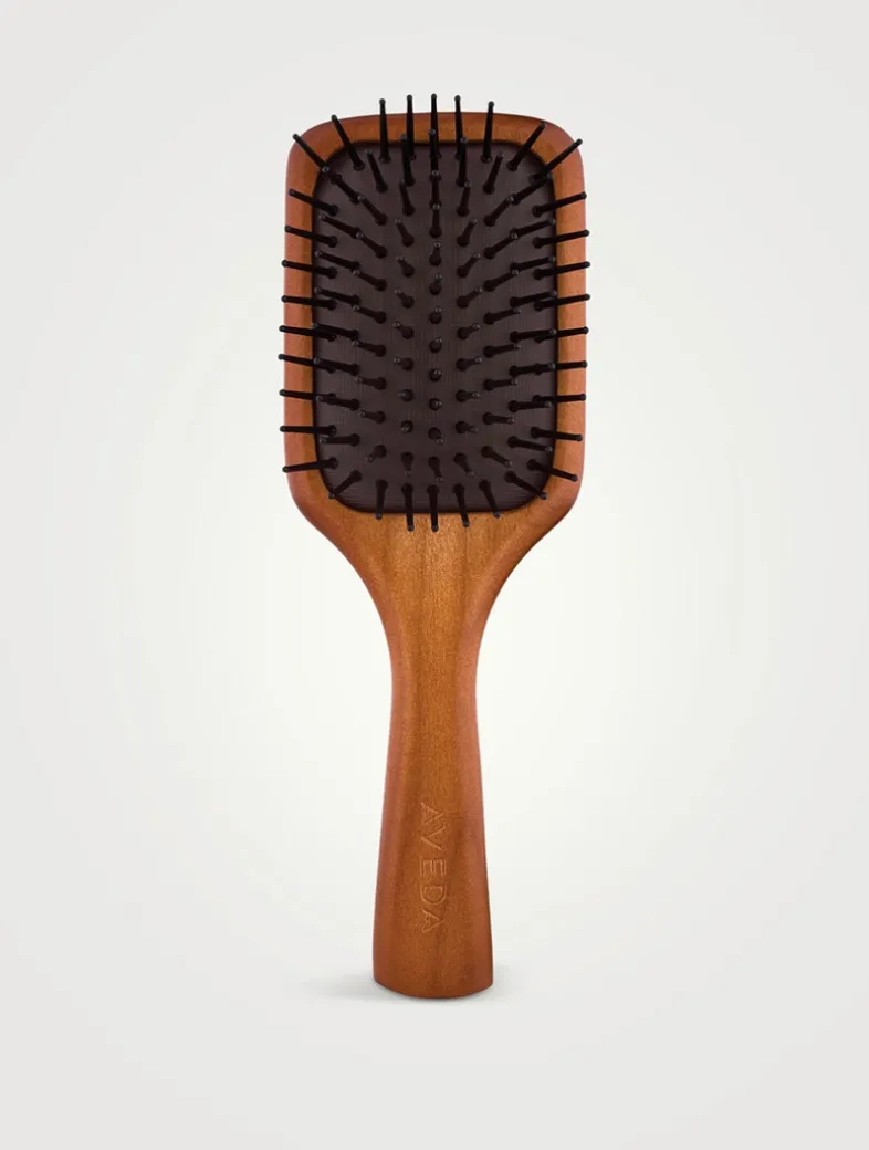 The Aveda Wooden Paddle Brush, now available in a mini for on-the-go styling. This professional mini paddle brush features extended bristles for easy detangling and reduces stress to hair and scalp during styling. Ideal for smoothing hair on the go to create smooth, straight styles. The paddle brush is designed with one bristle missing in the bottom-middle half of the brush. This hole is to provide ventilation and to aid in drainage after the brush has been washed. Additionally, it helps to prevent any bacterial growth that could occur with pooling water on the inside of the brush.