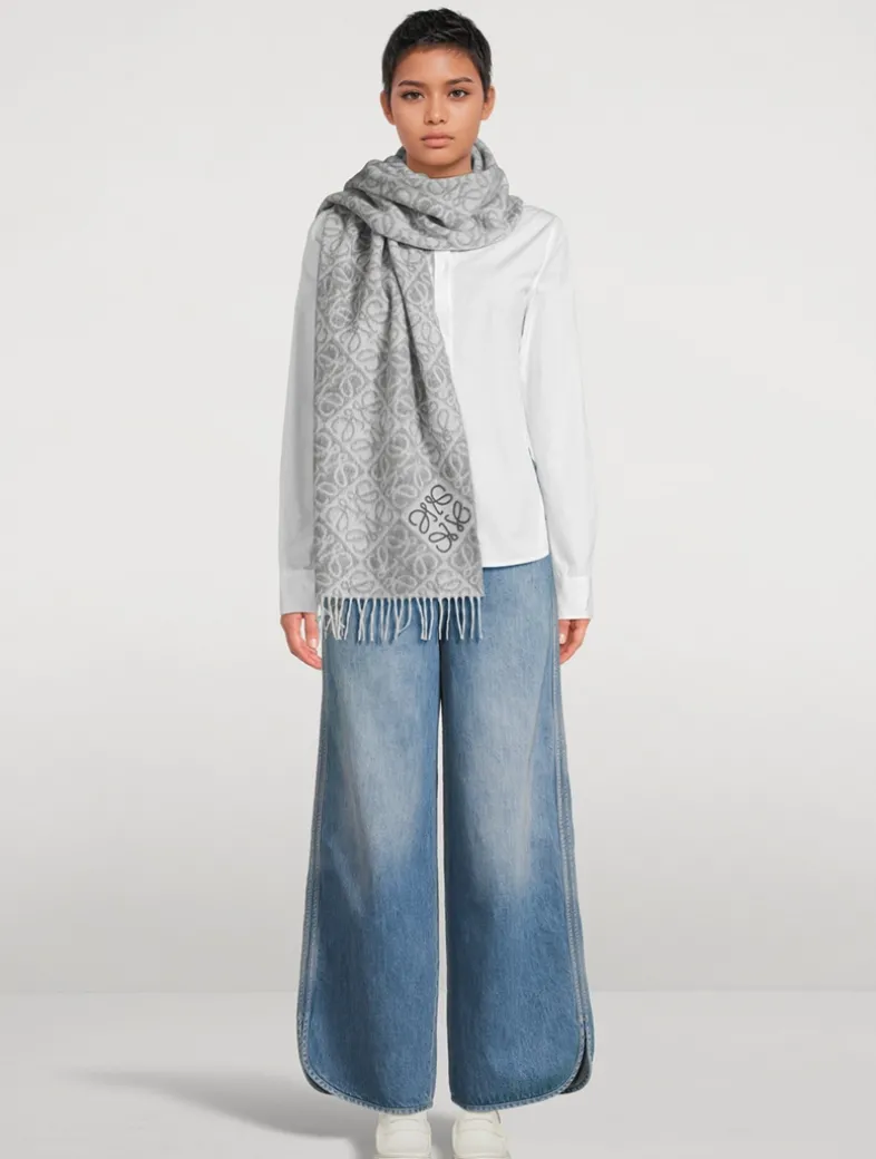 A double-face wool and cashmere jacquard scarf featuring a two-tone Anagram pattern, finished with Anagram tufted embroidery at the corner.