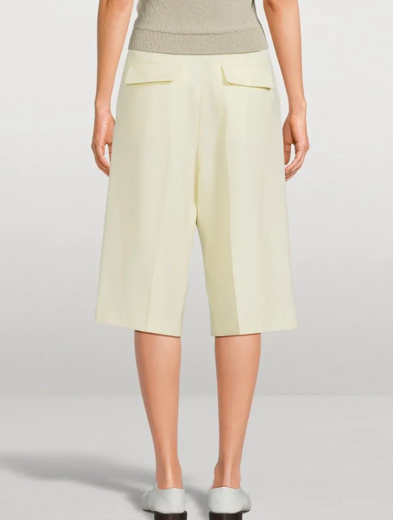 Flaunting a mensy design, these shorts have a generous wide leg and notched waistband with belt loops. They are crafted from virgin wool with a supple drape. Slip pockets at the sides and flap pockets at the rear complete the look.