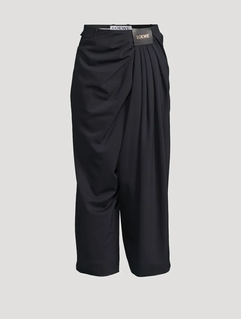 Tailored in fluid, lightweight wool, these loose-leg trousers feature an asymmetric hand-gathered draping at the front. Designed for a relaxed fit, the mid-waist style is complete with side pockets, a rear jet pocket, and a LOEWE-embossed leather patch at the front.