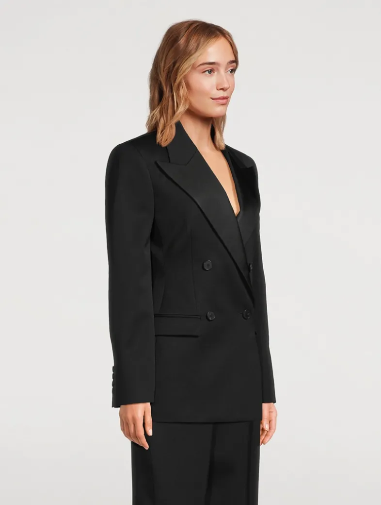 This structured jacket is crafted in grain de poudre wool, and features a satin pointed collar, and double-breasted silhouette. Featuring a satin lining, this blazer is finished with buttoned cuffs, one chest pocket, and two front flap pockets.