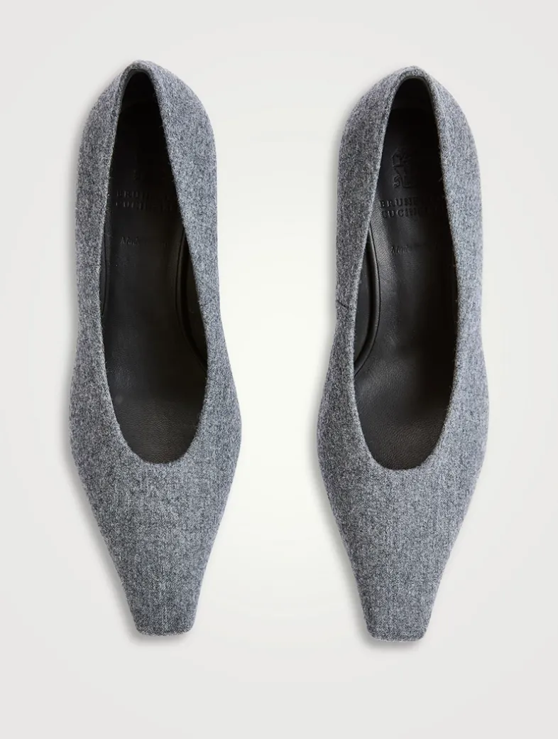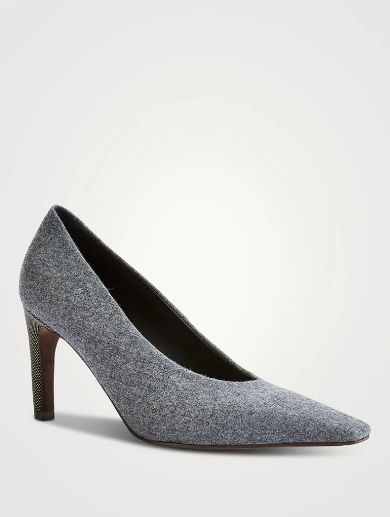 Sartorial inspiration and precious details define these water-resistant virgin wool flannel heels. The entire surface of the heel is embellished with a shiny embroidered of rows of precious monili.