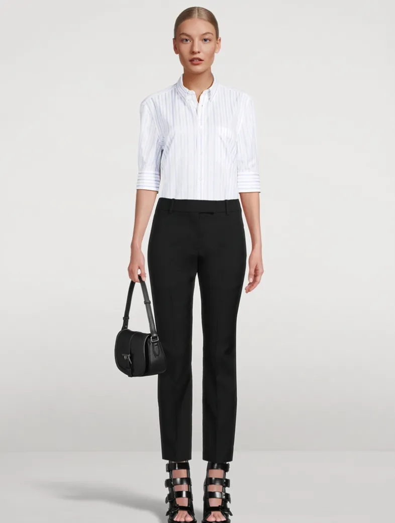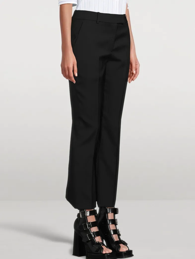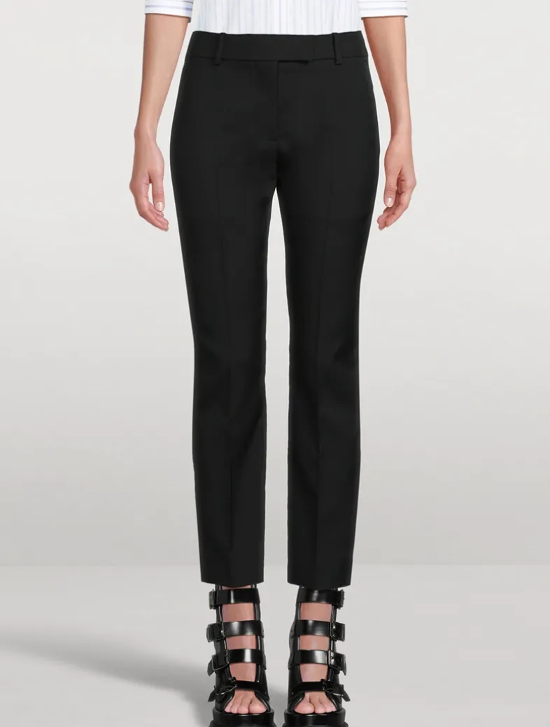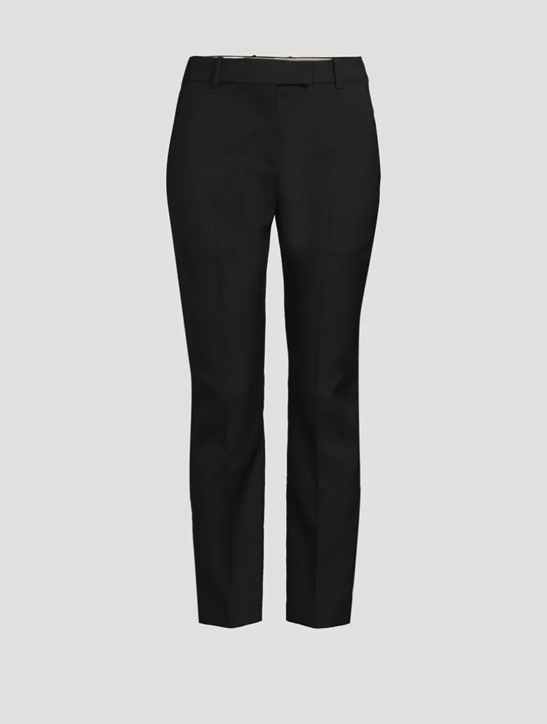 A mid-rise waist and a slim-leg cut lends a feminine touch to these trousers. They are crafted in wool gabardine with belt loops and a rear buttoned welt pocket.