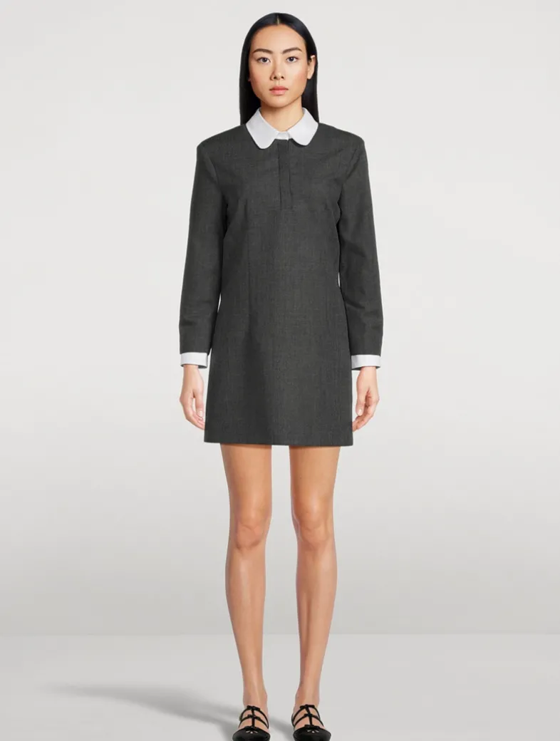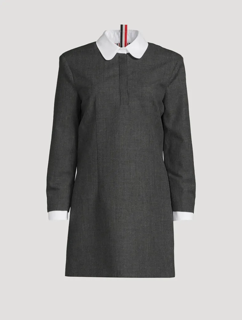 This sharp, limited-edition dress marries the enduring elegance of the classic shift silhouette with distinctive Thom Browne emblems. Crafted from wool trimmed with cotton, it has buttoned cuffs with signature striped grosgrain trim and matching striped grosgrain loop tab.