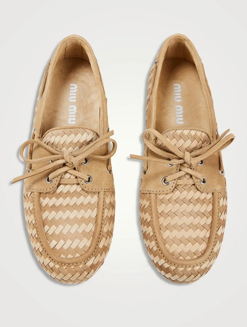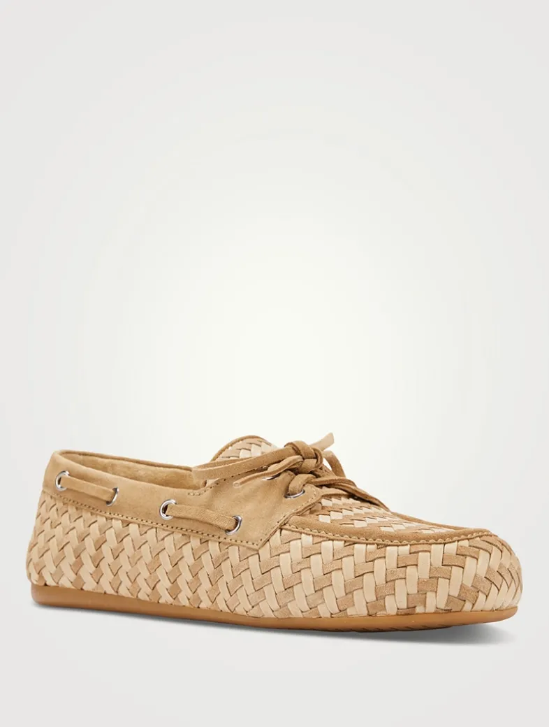 Vintage inspiration and a collegiate attitude are combined in these boat-style loafers. They are crafted in slim strips of woven suede with a tone-on-tone finish. Lacing at the vamp completes the look.