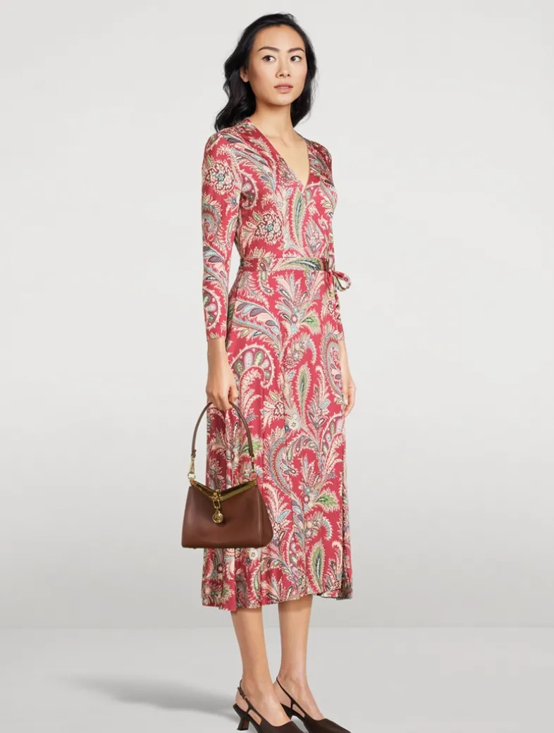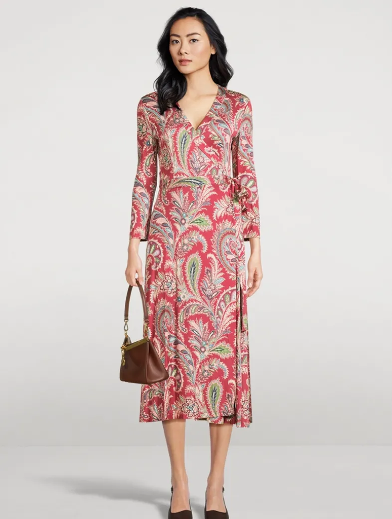 This wrap-style midi dress in glossy stretch jersey is detailed with decorative, all-over floral Paisley print.