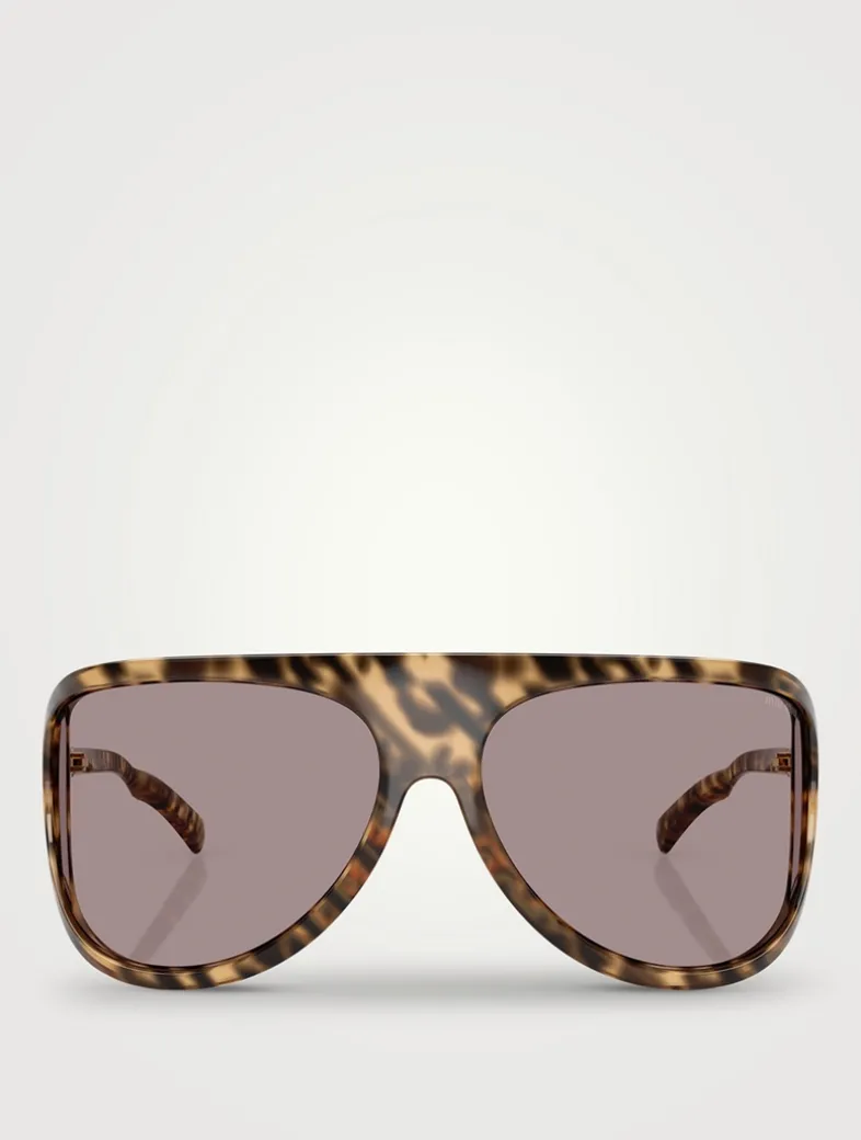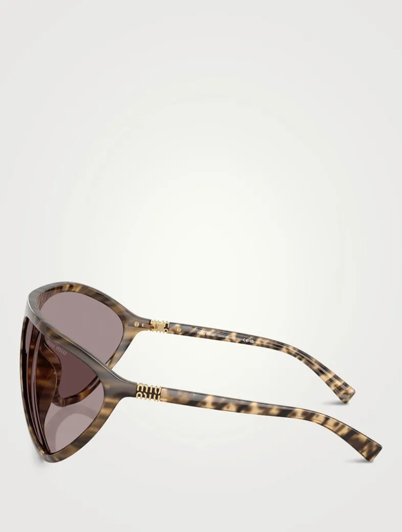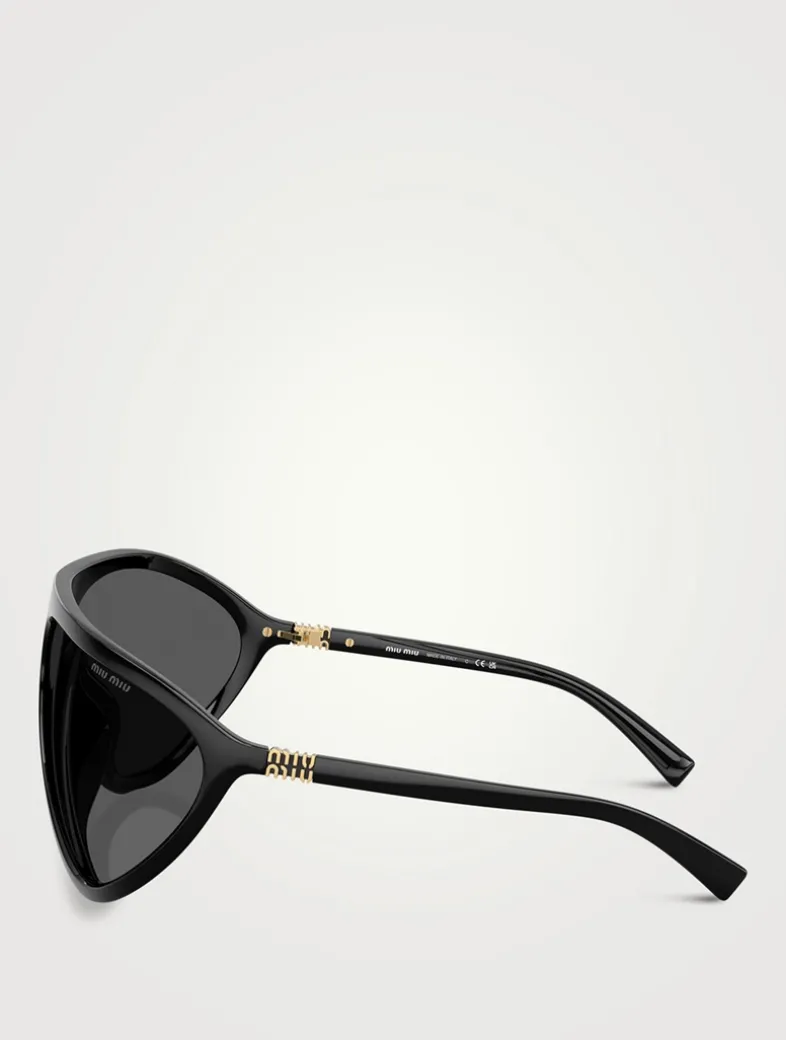 Crafted from full acetate with a bold, wraparound aviator shape, these sunglasses are adorned with a gold-coloured Miu Miu vertical logo on the thin temples.
