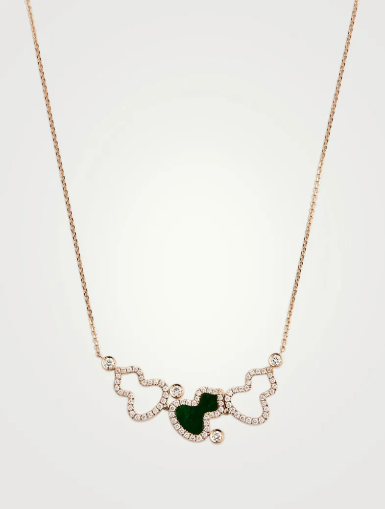 Echoing the curves of the lucky number 8, Wulu is the most powerful symbol of good fortune and positive energy in China. This adjustable chain necklace features a trio of diamond-framed Wulu pendants. Suspended at either end from a classic adjustable chain, the pendant is inlaid with glowing jade and accented with bezel-set diamonds.