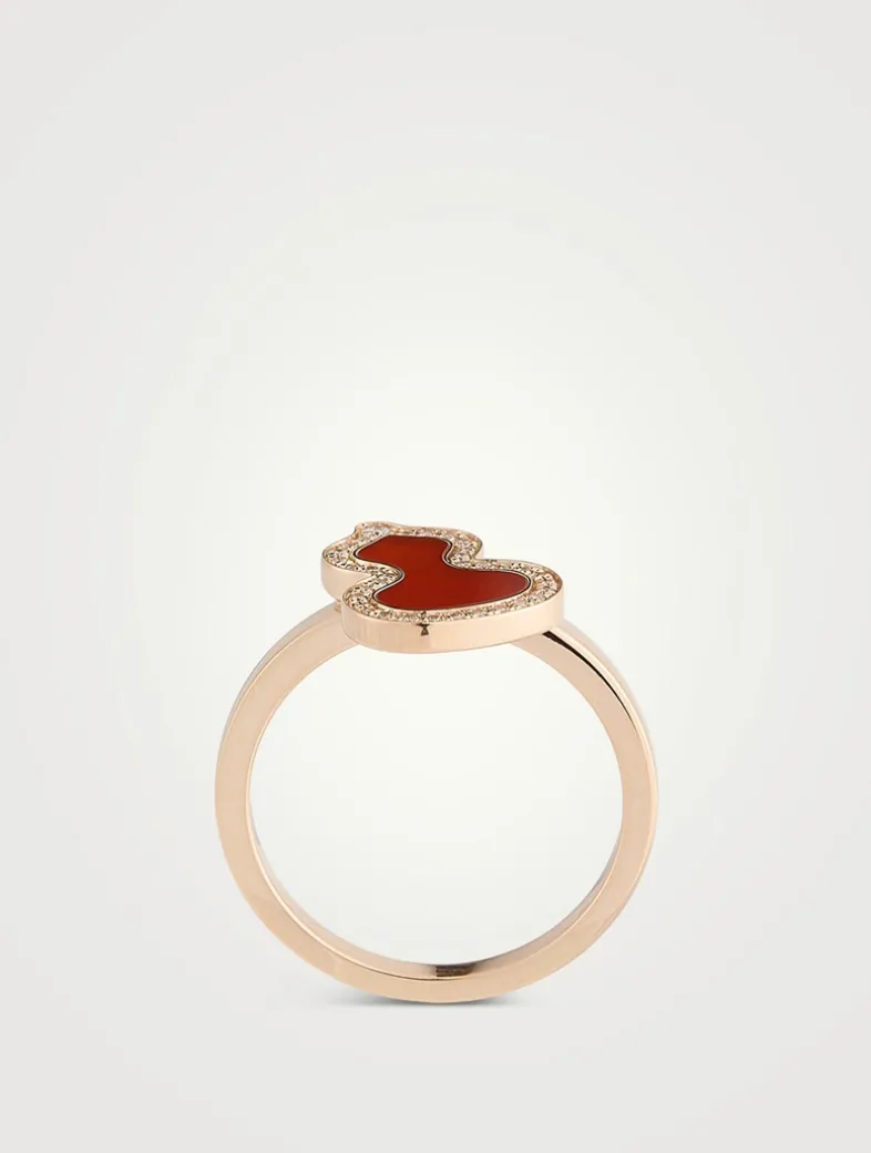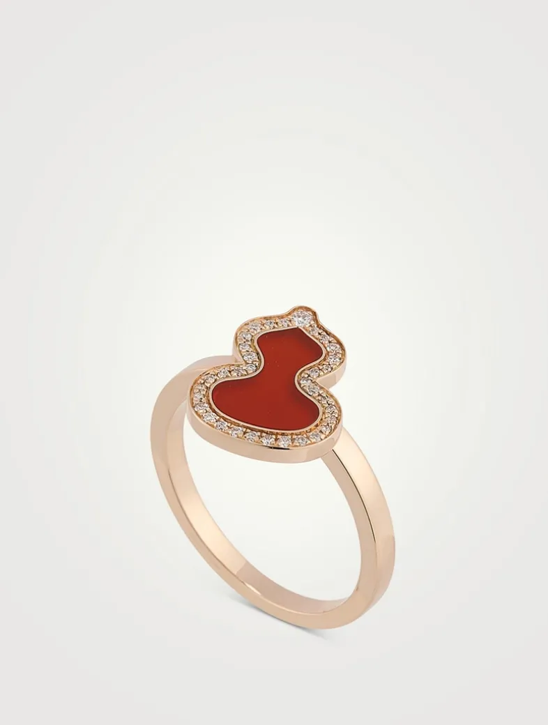 Echoing the curves of the lucky number 8, Wulu is the most powerful symbol of good fortune and positive energy in China. Set atop a slender band is a red agate Wulu motif framed with diamonds.