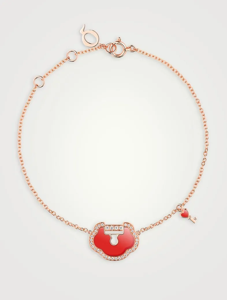 From the Yu Yi collection. Worn as an accessory in ancient China and often depicted in traditional arts and crafts, Yu Yi is a symbol of protection and spiritual potency and is said to have the power to fulfill dreams. Set on a classic chain, this bracelet features a diamond-set red agate lock pendant with dangling key charm.