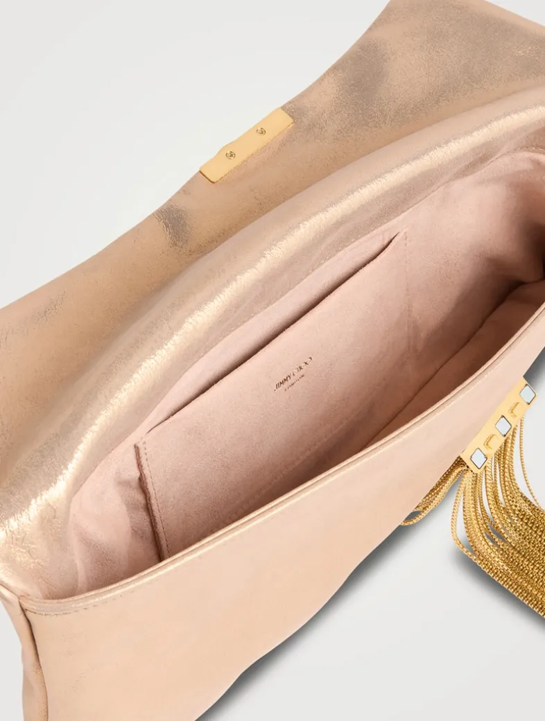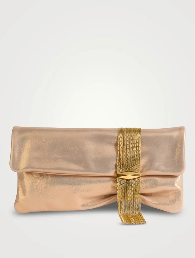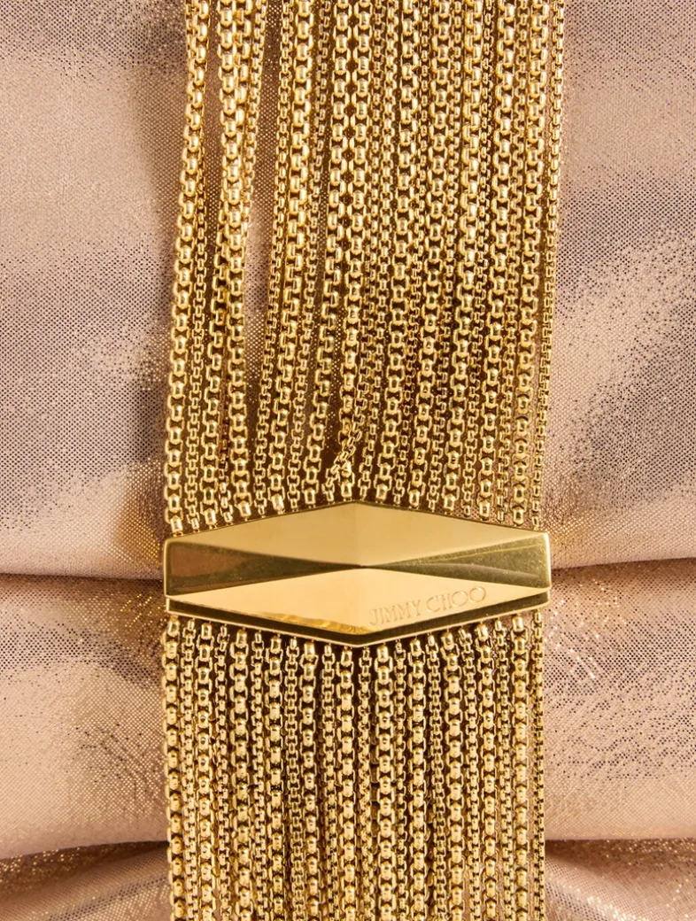 Crafted from shimmering metallic leather, the Zandra clutch is wrapped by a chain fringe bracelet that creates a unique, soft silhouette. It is a statement style, complemented by Jimmy Choo’s signature Diamond hardware.