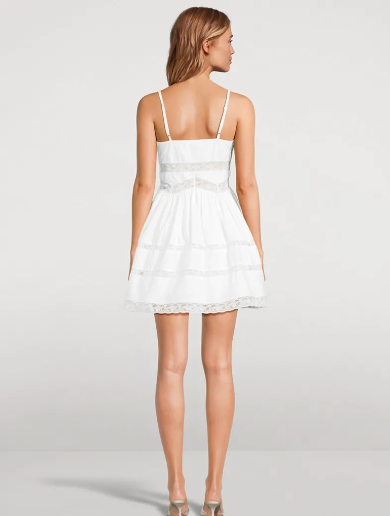 This vintage-inspired mini is designed from a crisp, poplin cotton fabric stripped with intricate laces at the body, neck, and the A-line skirt. With a fit-to-flare, structural silhouette, the flirty dress gives off a flattering fit. A bow detail sits at center front alongside thin spaghetti stripes, a scoop neckline, and an airy skirt. This piece includes a side seam zipper.