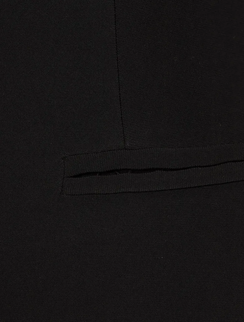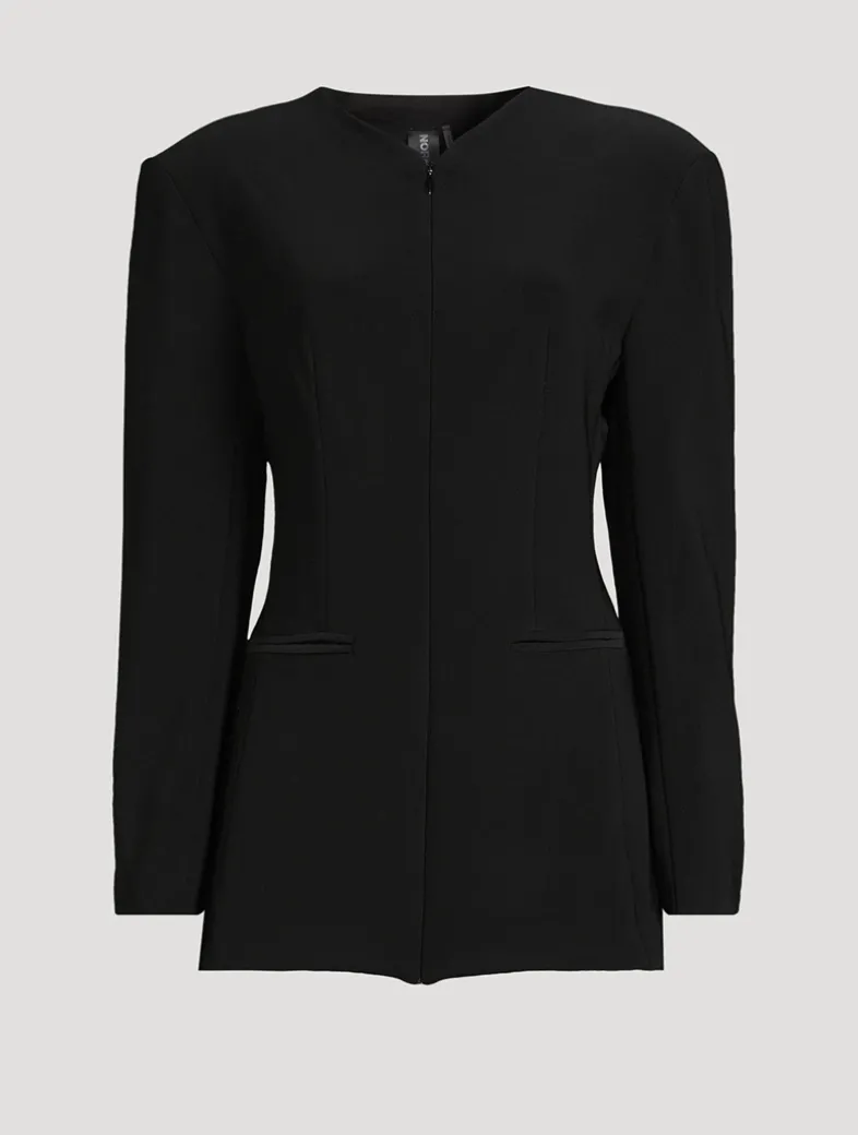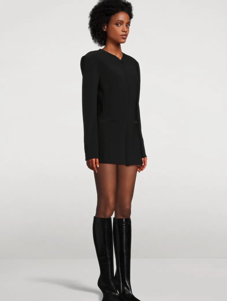 Blending the tailoring of a menswear-inspired jacket with the styling of a mini dress, this piece exudes a minimalist elegance. It has strong padded shoulders and a nipped-in waist. Welt pockets and a zip-front closure complete the look.