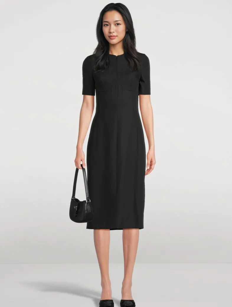 This curve-skimming pencil dress is crafted in Italy from wool-blend tailoring. Finished with a front and back zip fastening and back button detailing.