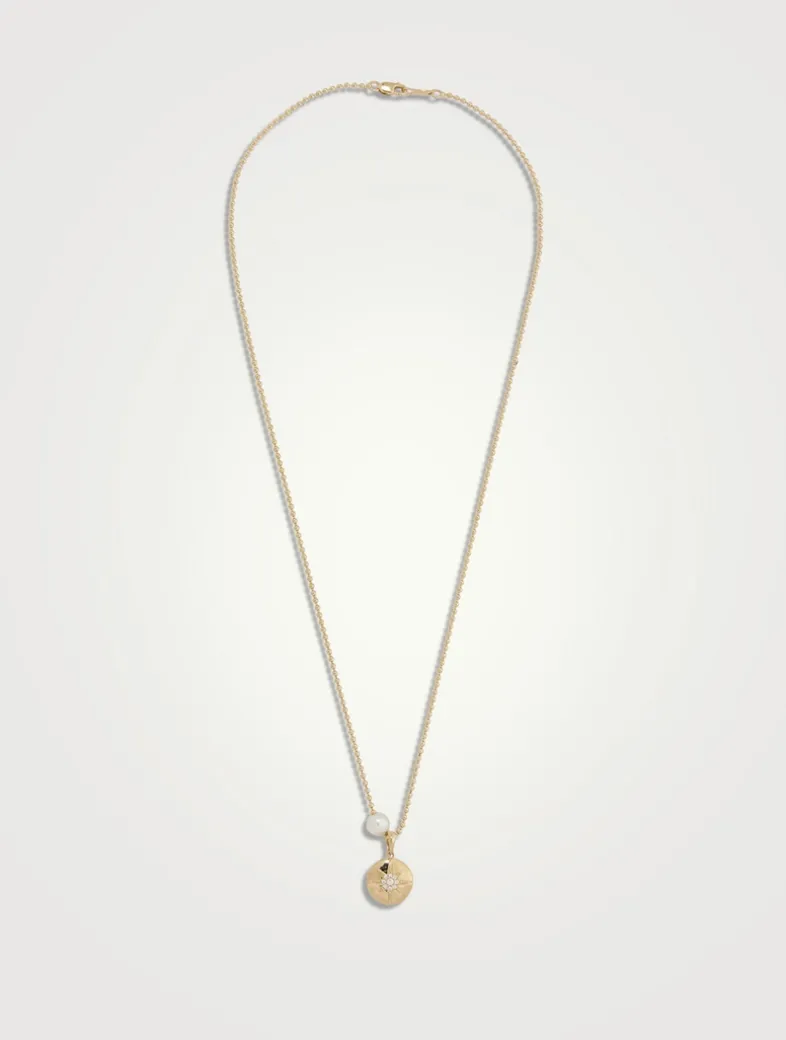 Made from 14k gold, this ball chain necklace features a diamond starburst coin pendant and single pearl accent.