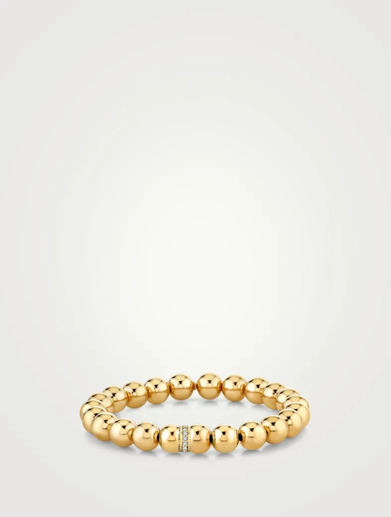 Strung with polished 14k gold beads, this slip-on bracelet features a 14k gold scalloped rondelle with diamonds. All Sydney Evan beaded bracelets are strung on a stretch cord along with a 14k gold SE logo charm.