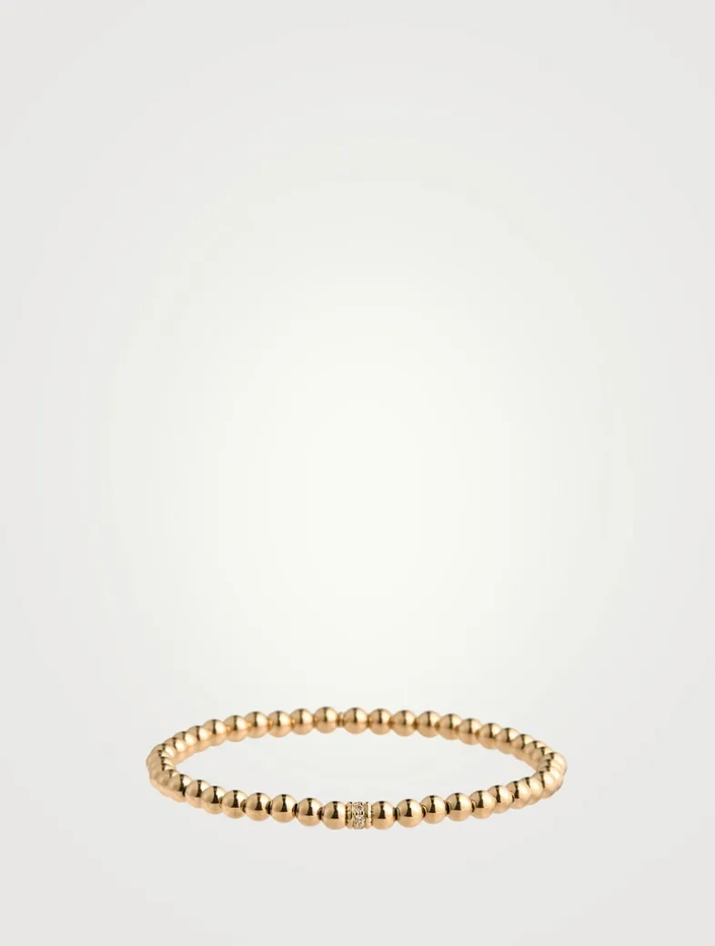 Strung with 14k gold beads, this slip-on bracelet features a scallop edge pavé diamond rondelle. All Sydney Evan beaded bracelets are strung on a stretch cord along with a 14k gold SE logo charm.