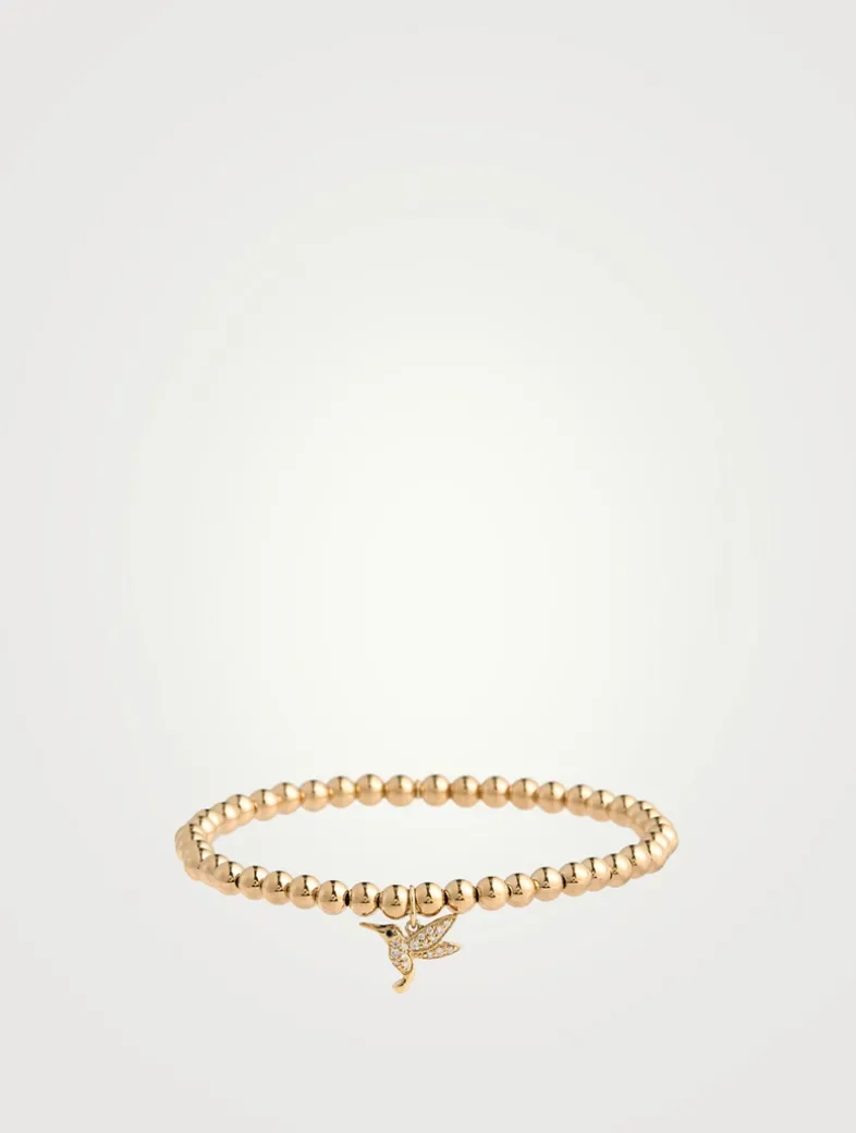 Strung with 14k gold beads, this slip-on bracelet features a small diamond hummingbird charm. All Sydney Evan beaded bracelets are strung on a stretch cord along with a 14k gold SE logo charm.