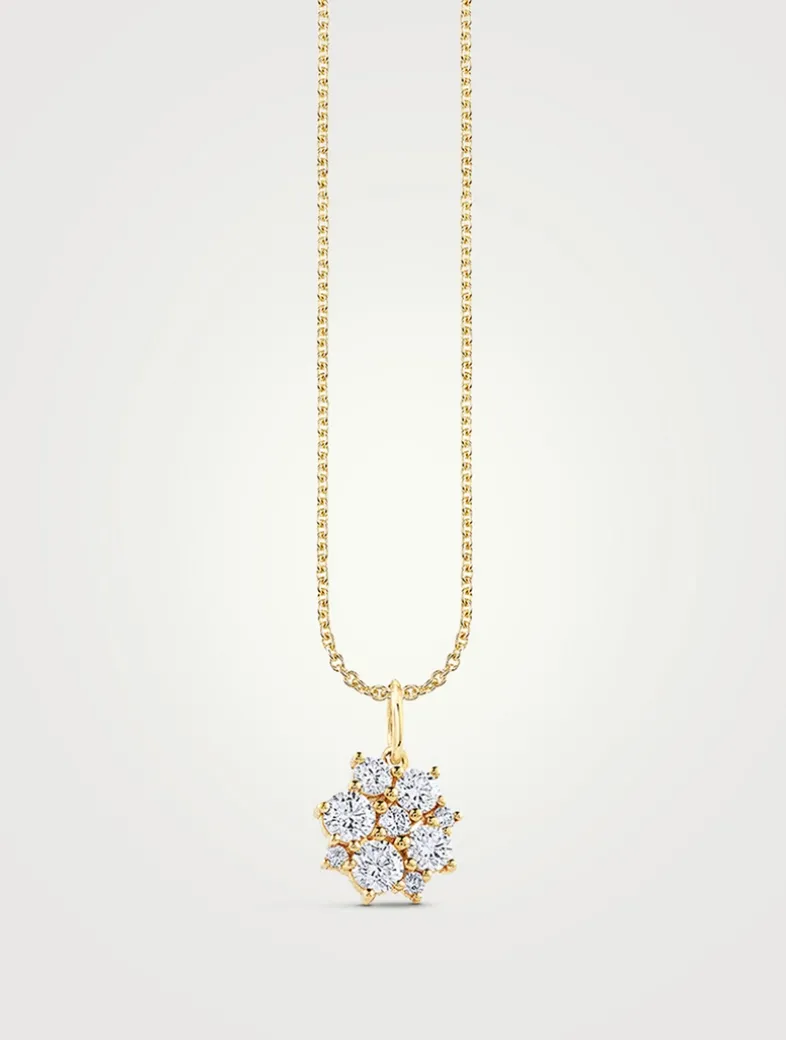Crafted in 14k gold, this statement pendant features a radiant cluster of prong-set diamonds in a bold disc silhouette—designed to dazzle like a classic cocktail ring.