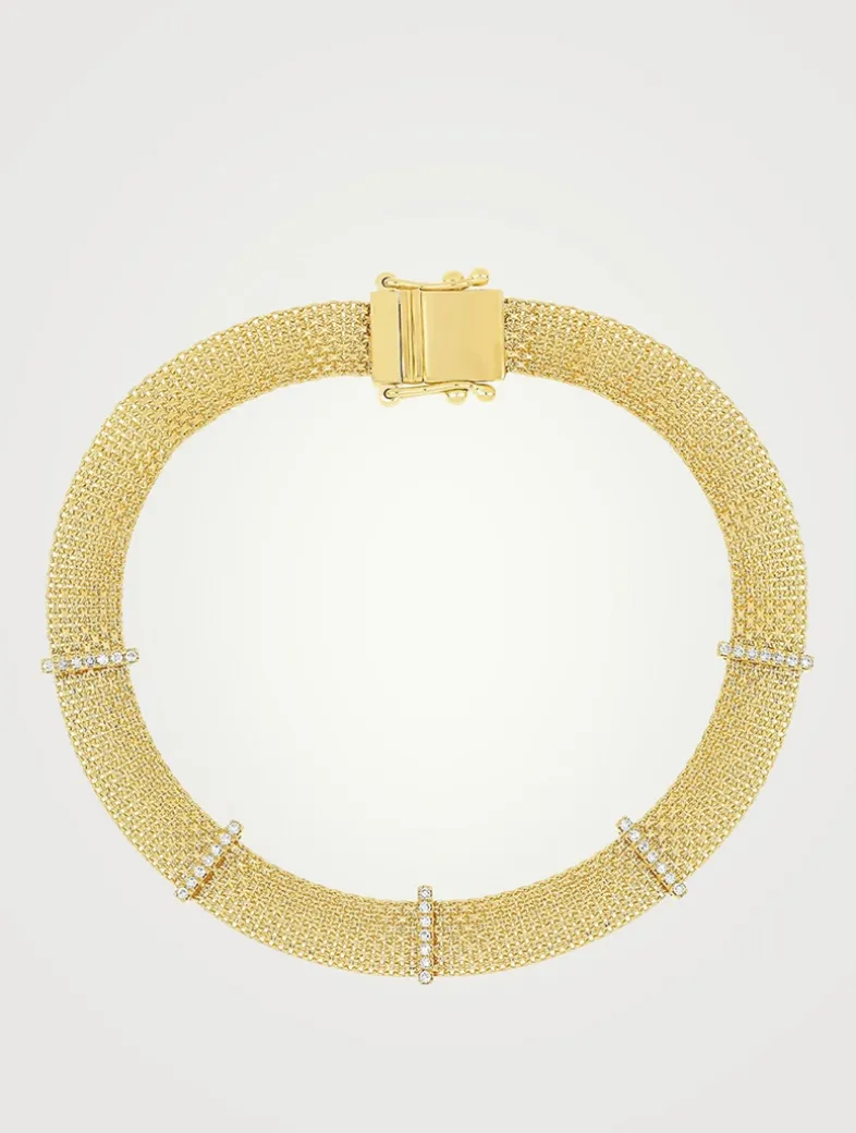 Made from a flexible woven gold mesh, this lightweight layering piece is accented by five diamond-encrusted bars.