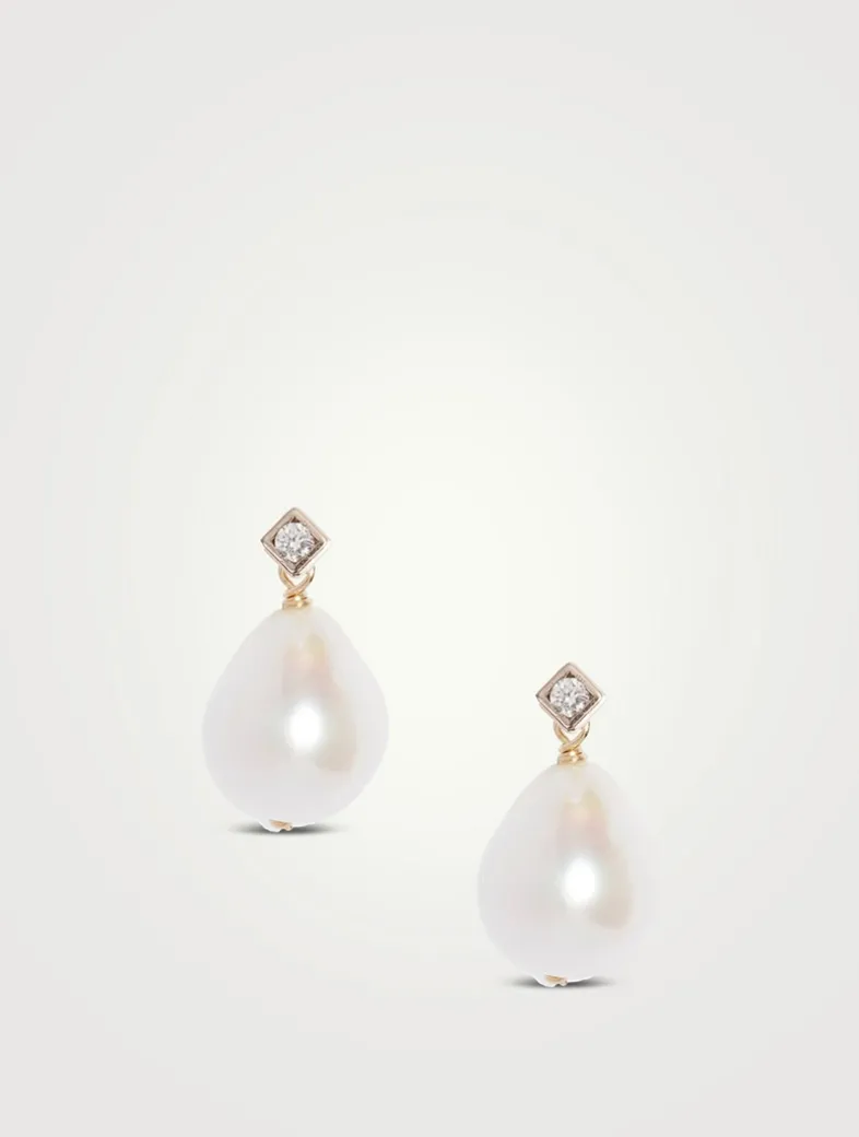 These elegant and timeless earrings showcase a delicate round diamond set in a 14k white gold diamond-shaped setting, with a lustrous large oval pearl dangling below for graceful movement and classic charm. Handcrafted in Vancouver, Canada.