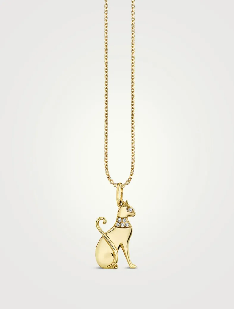 This fine chain necklace features a sleek Egyptian cat charm in 14k gold, accented with sparkling diamonds at the eye and collar.