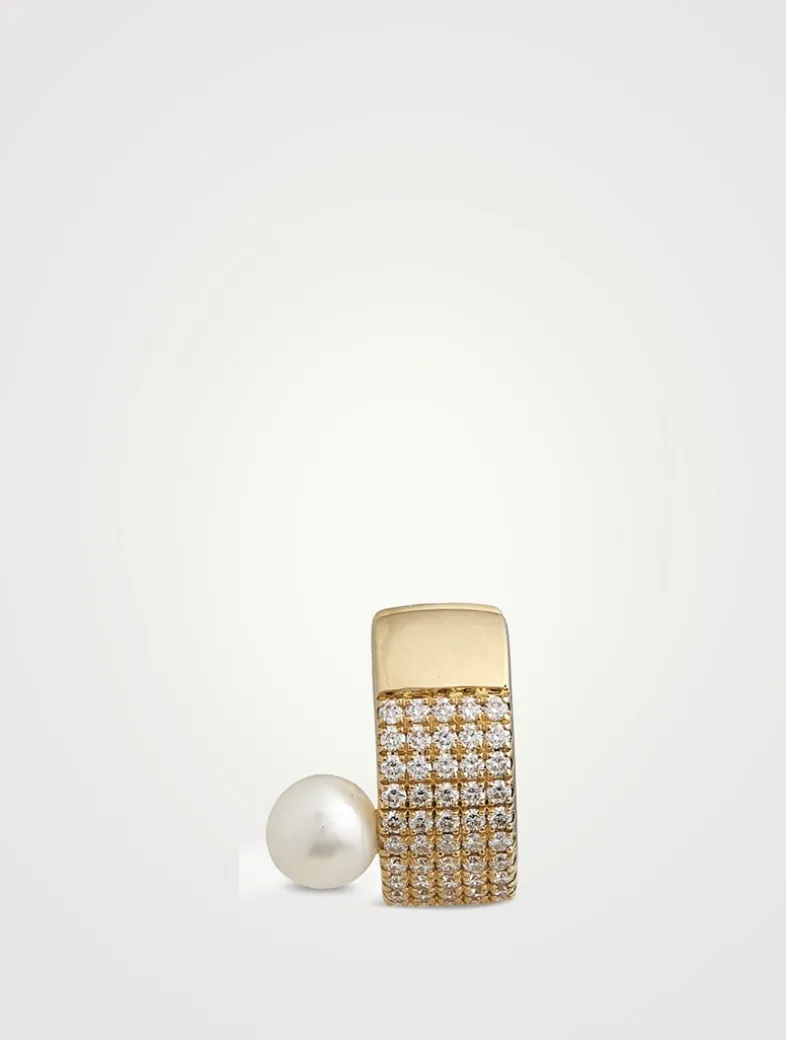 Made from 14k gold, this single ear cuff is set with one pearl and five rows of sparkling diamonds.