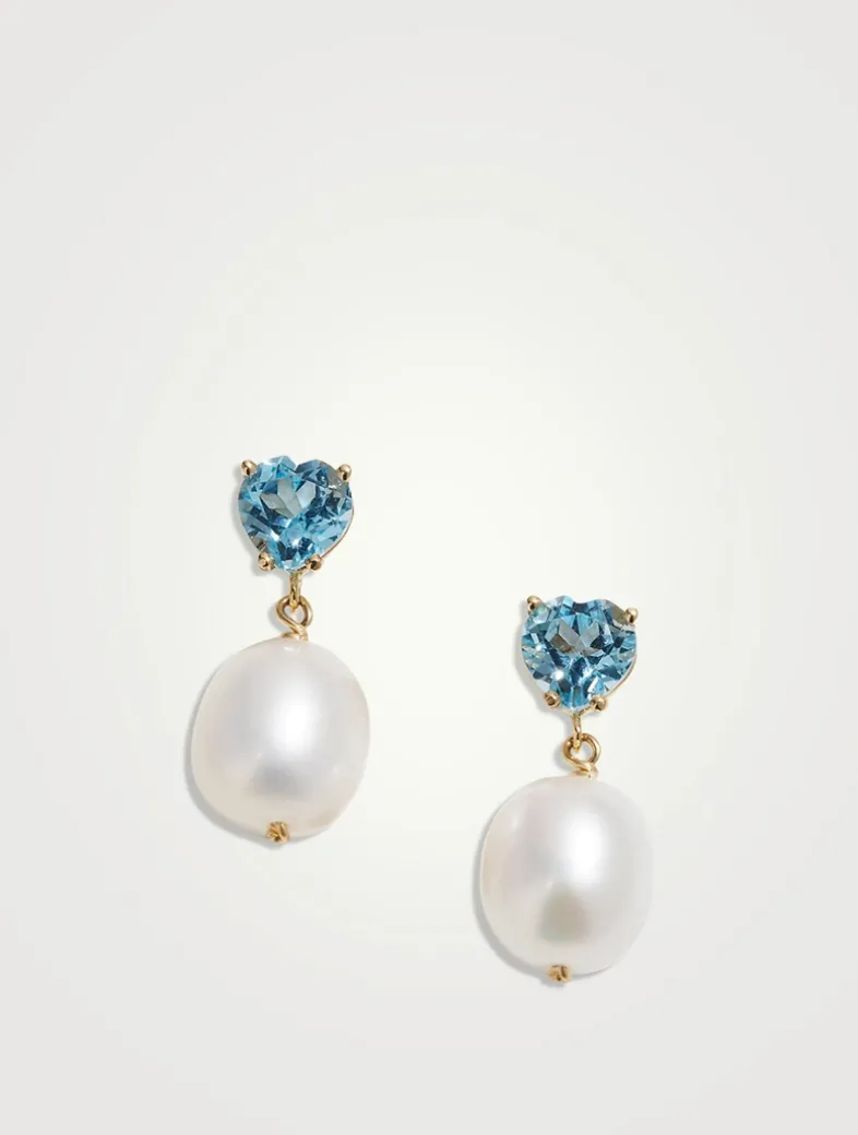 This elegant pair of earrings showcases a vibrant heart-shaped gemstone atop a large oval pearl, delivering the perfect pop of colour to make a statement. Handcrafted in Vancouver, Canada.