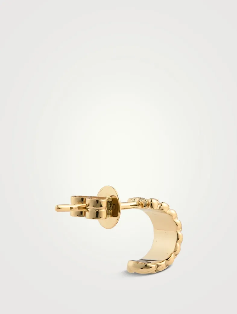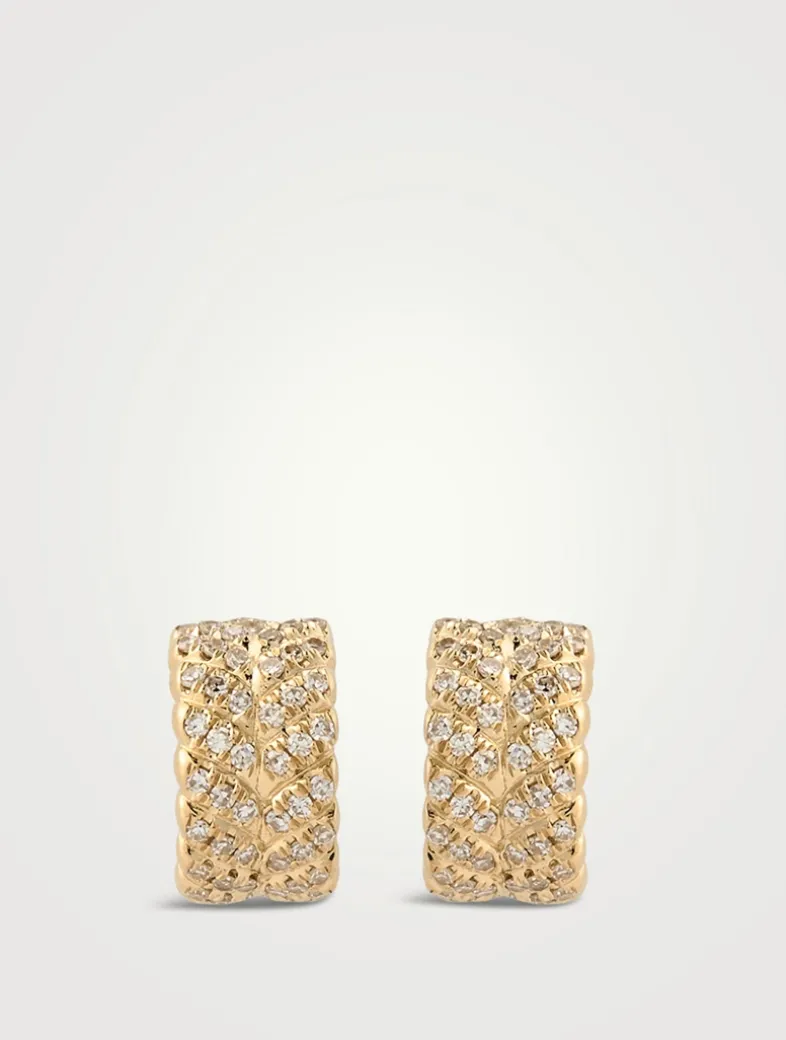 Cast in gleaming 14k gold, these huggie hoops are defined by their sparkling diamond herringbone pattern.