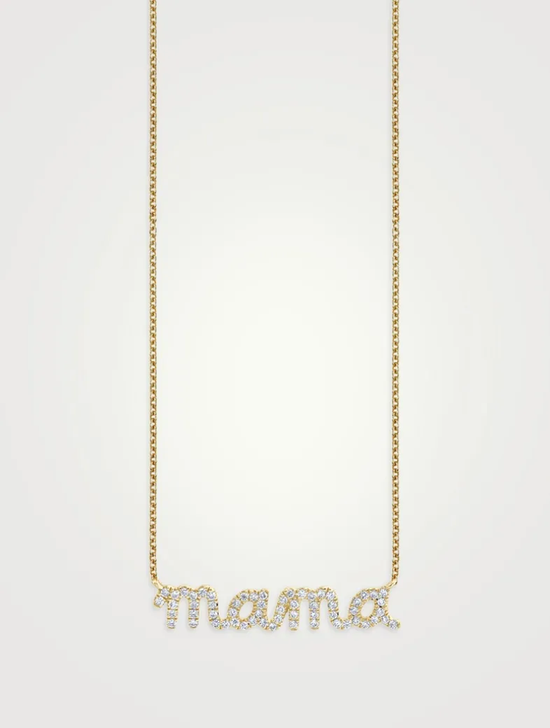 A meaningful necklace crafted in 14k gold, featuring “mama” in Sydney Evan’s signature hand-drawn script and embellished with pavé diamonds.