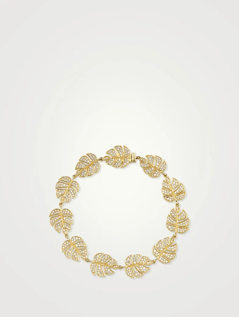 This 14k gold eternity bracelet is composed of pavé-set monstera leaf links, each detailed with sparkling diamonds.