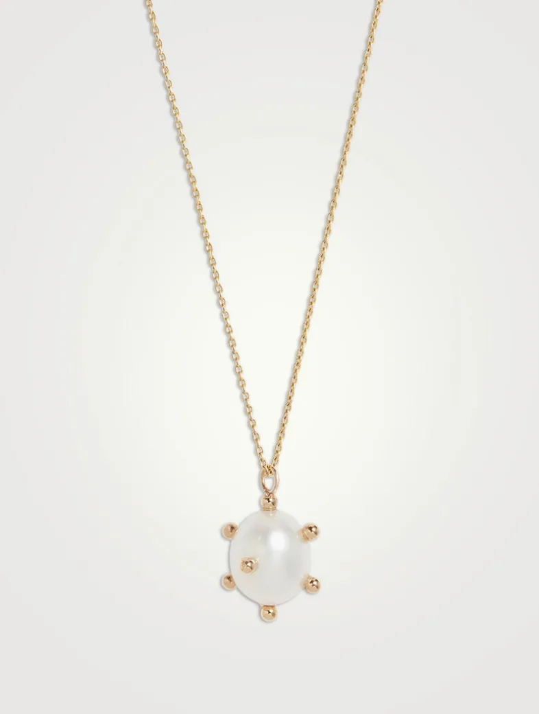 This 14k pendant necklace showcases a stunning large oval pearl adorned with delicate gold dots, a perfect blend of classic elegance and modern edge.