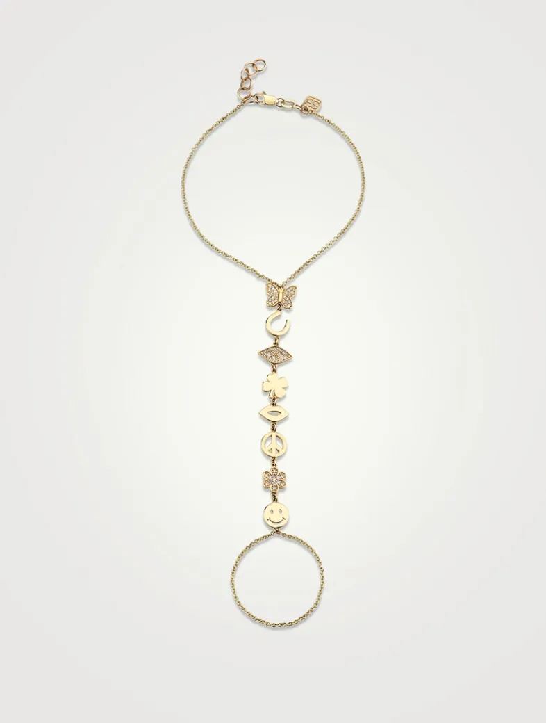 This 14k gold bracelet features a delicate chain that wraps around the wrist and finger, with an elegant extension adorned with Sydney Evan’s iconic charms, some inlaid with glimmering diamonds.