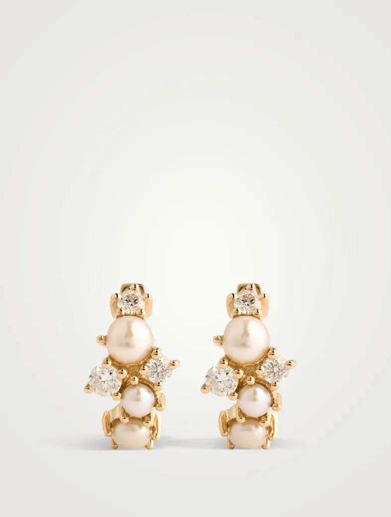 These 14k gold cocktail huggie hoops feature a stunning mix of prong-set diamonds and pearls.