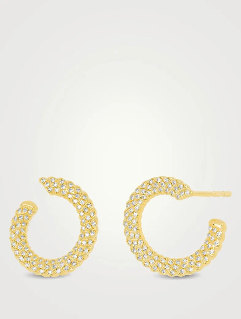 Featuring ribbons of pavé diamonds and gold with a semi-circle shape that envelopes the lobe, these earrings offer an unexpected twist.