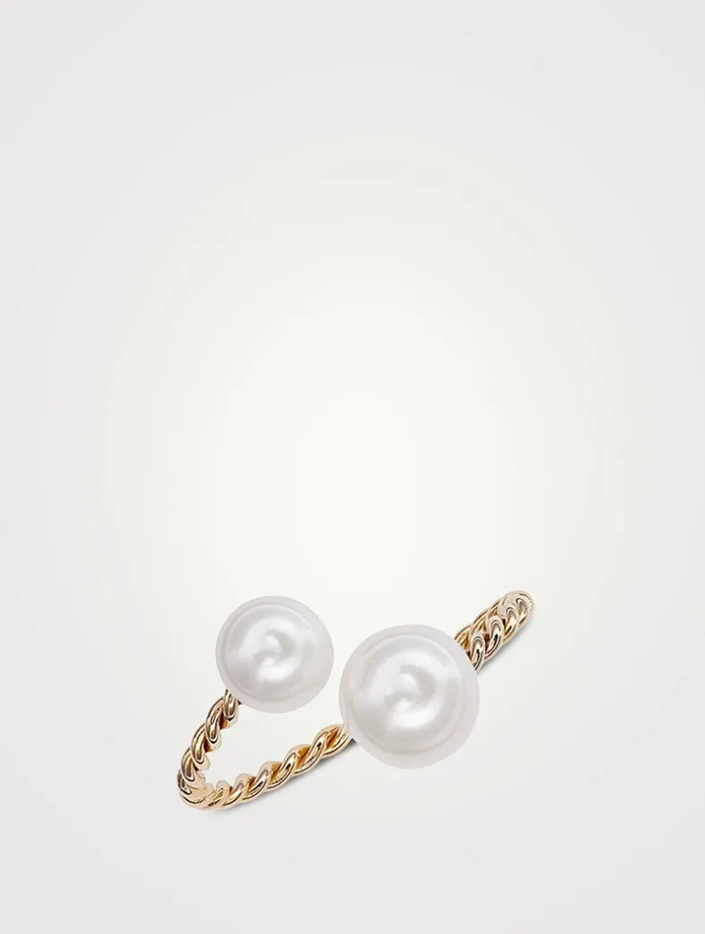 Two lustrous pearls set on an open style with a handcrafted gold twist band made with 14-karat recycled gold. Handcrafted in Vancouver, Canada.