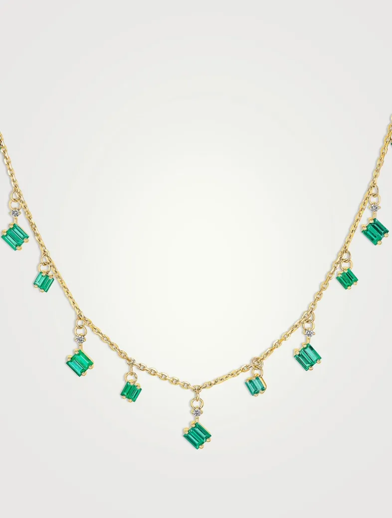 Crafted in 18k gold, this necklace is set with emerald baguettes and round white diamonds. The petite stations make the brilliant necklace a subtle statement.