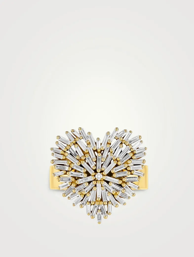 Stunning diamond baguettes are used to craft a beautiful and updated heart shape in this ring by Suzanne Kalan. This exquisite ring features a full carat of diamonds and is set in 18k gold.