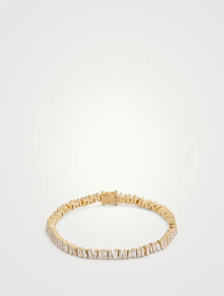 This beautiful tennis bracelet incorporates Suzanne Kalan’s beloved baguette white diamonds unevenly set all the way around.