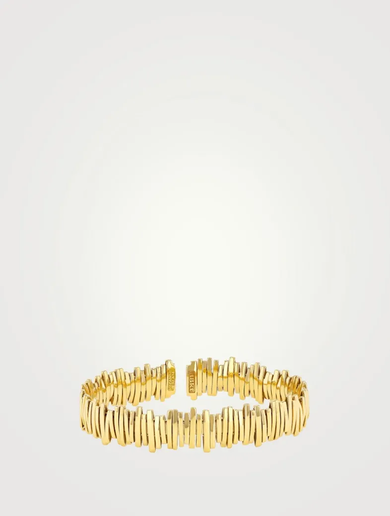 Each individual piece of gold that goes to make up this stunning gold bangle is meticulously strung onto an 18k spring gold wire, creating a strong and flexible bangle that effortlessly slips on and off your wrist. A true masterpiece of craftsmanship, this bracelet is both durable and comfortable to wear all day long.