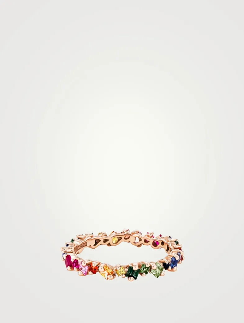 This exquisite piece is a symphony of light, featuring an array of 28 baguette and princess-cut rainbow sapphires, each chosen for their radiance and clarity. Set in 18k rose gold, it’s a modern and fun piece from the La Fantaisie collection.
