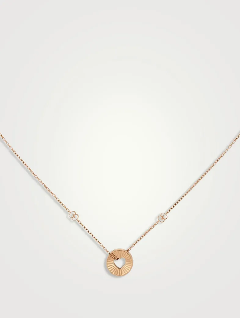 This pretty necklace features a small heart cutout pendant. The pink gold chain is detailed with the brand’s logo in stations.