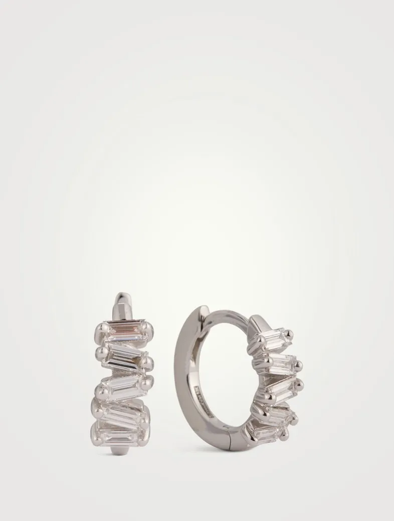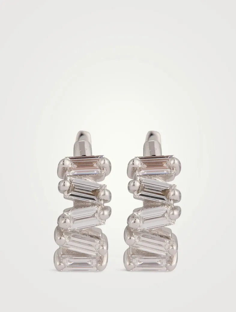 Crafted in 18k white gold, these huggies feature elegant baguette diamonds designed in Suzanne Kalan’s iconic style.