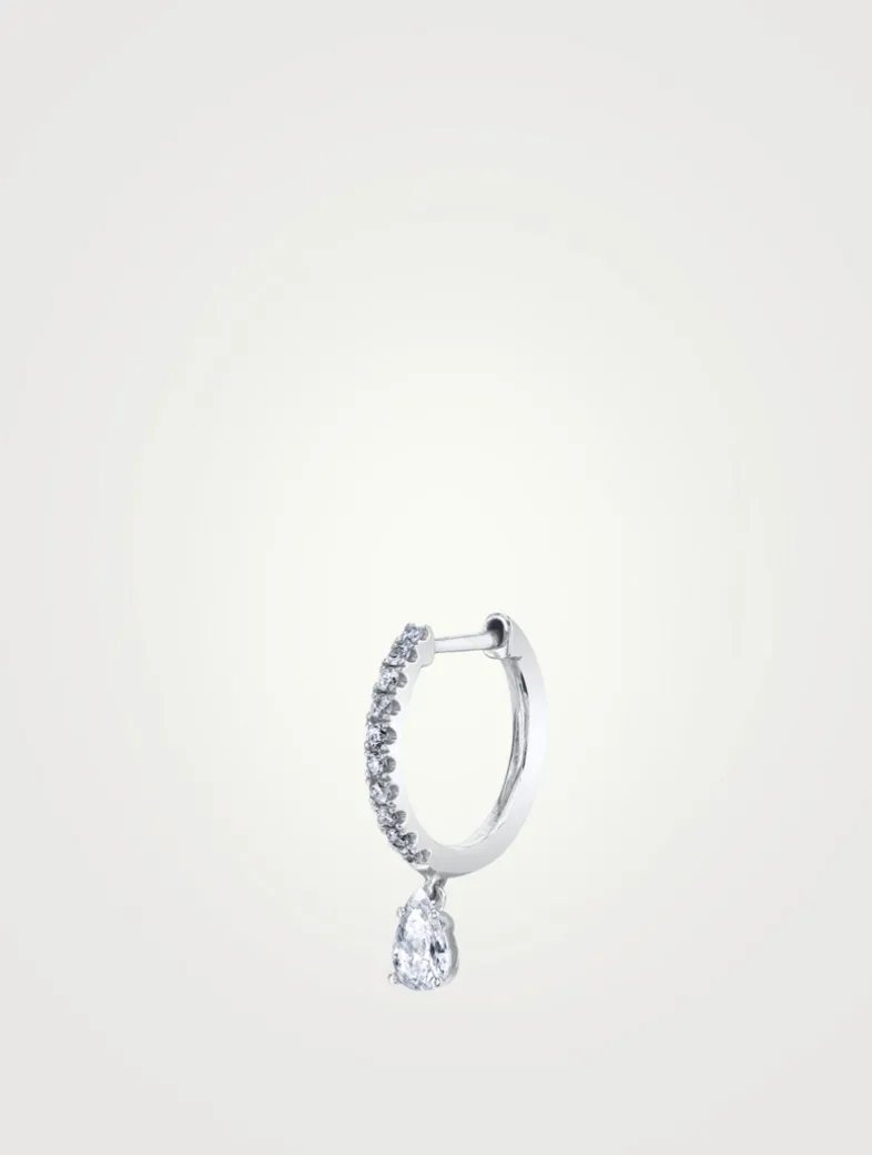 A single earring, this slim hoop is traced with pavé diamonds and accented with a dangling pear diamond.