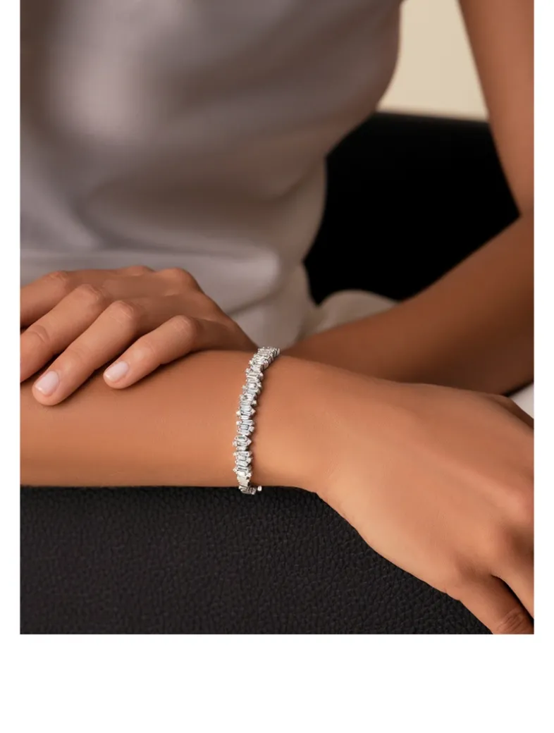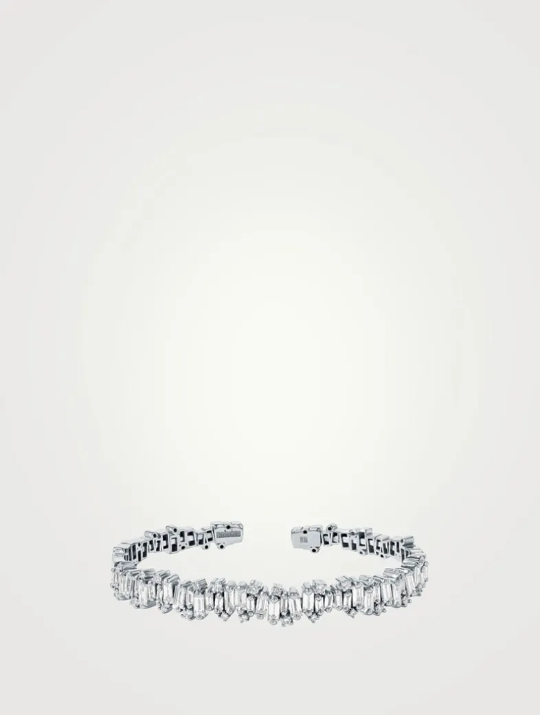 Exquisitely handcrafted in white gold, this bangle is adorned with over three carats of striking white diamond baguettes and round diamonds.